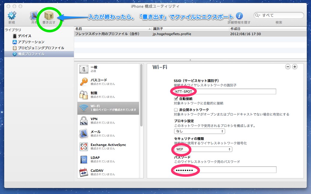 http://macmemocho.yotsumeyui.com/iphone/%E3%83%95%E3%83%AC%E3%83%83%E3%83%84%E3%82%B9%E3%83%9D%E3%83%83%E3%83%88%E7%94%A8%E3%81%AEiphone%E6%A7%8B%E6%88%90%E3%83%97%E3%83%AD%E3%83%95%E3%82%A1%E3%82%A4%E3%83%AB%E3%82%92%E4%BD%9C%E3%81%A3%E3%81%A6%E3%81%BF%E3%82%8B%EF%BC%81フレッツスポット用のiPhone構成プロファイルを作ってみる!