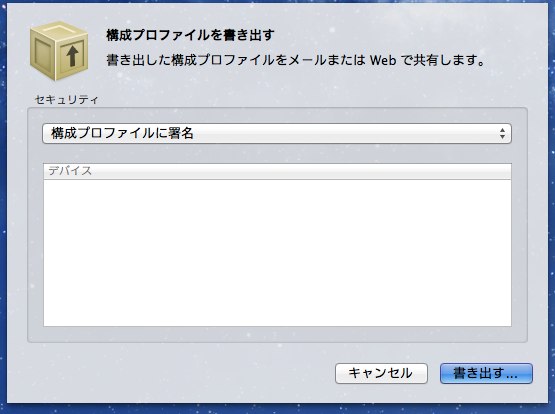 出てきた画面で、セキュリティは、[構成プロファイルに署名]のままにして、右下の[書き出す]ボタンを押します。