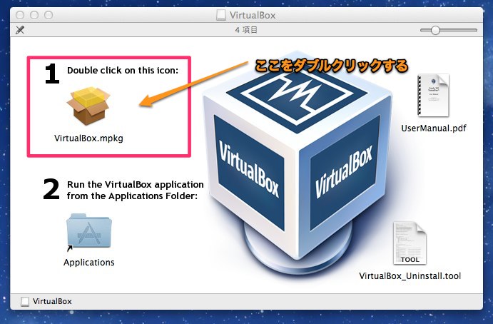 ダウンロードしたファイルは、dmgファイルを実行すると以下の画面が出てきます。1番をダブルクリックすると、インストールが始まります。