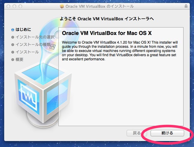 下のような、インストーラ画面になるので、「続ける」をクリックします。