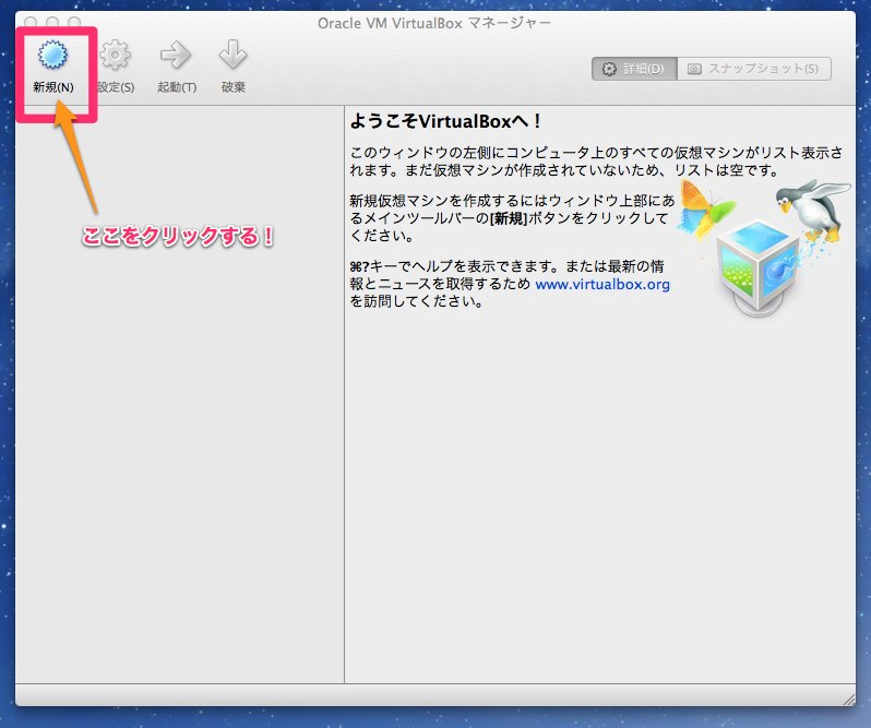 Virtualboxを起動して、左上にある「新規」をクリックします。